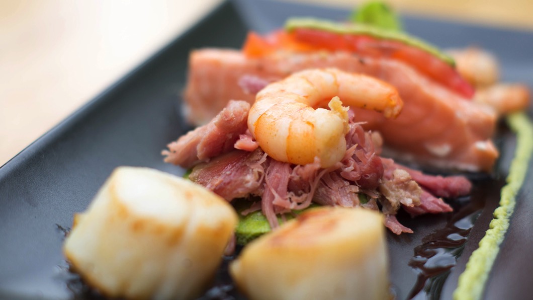 Scallops, Slow Cooked Ham Hock with Home Cured Beetroot and Vodka Salmon