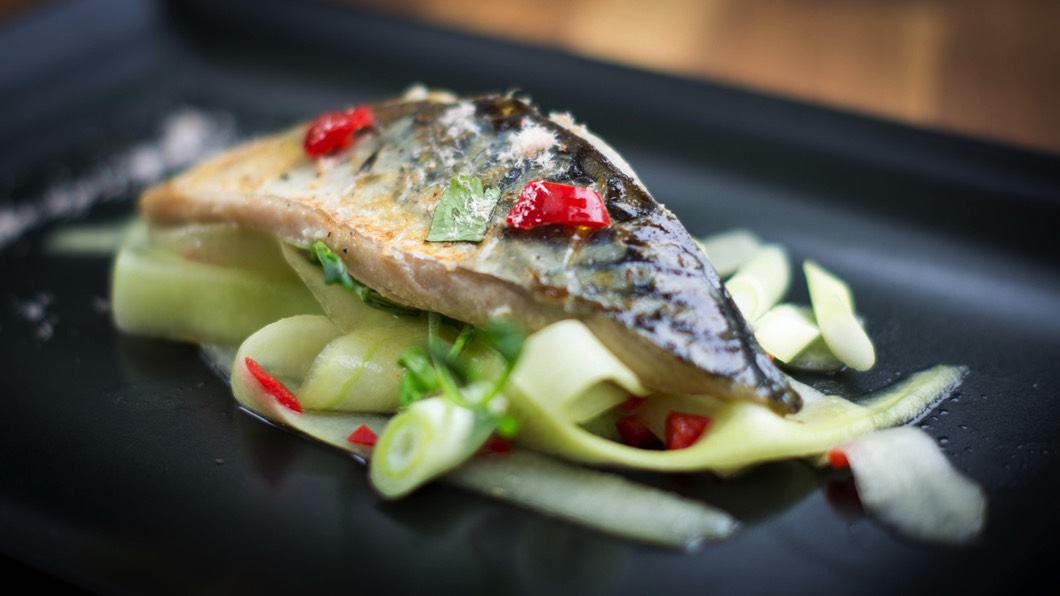 Mackerel on a bed of Cucumber, Spring Onion and Chilli.
