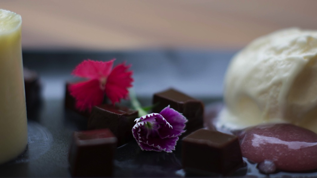 Homemade Lemon Curd and Cornish Clotted Cream Ice Cream, Baileys and Coffee Chocolate Jelly Cubes and Strawberry Dust.