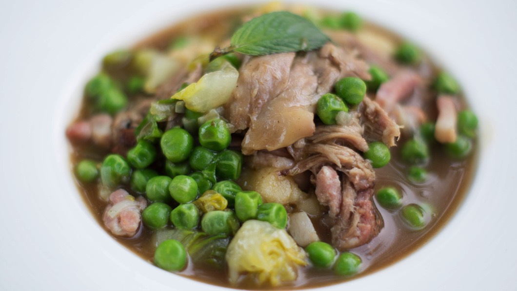 Chicken, Ham Hock, Cabbage and Serrano Ham with Home Smoked Parmesan Starter.