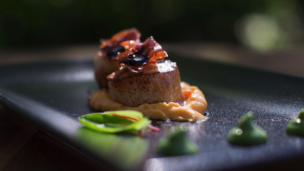 Roasted Lightly Smoked Fresh Wild Salmon, Scallops, Gently Spiced Prawns on a Pea Omelette with Honny Cress and Lettuce Puree.