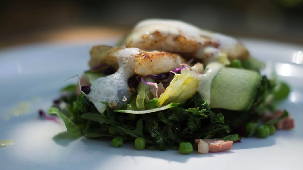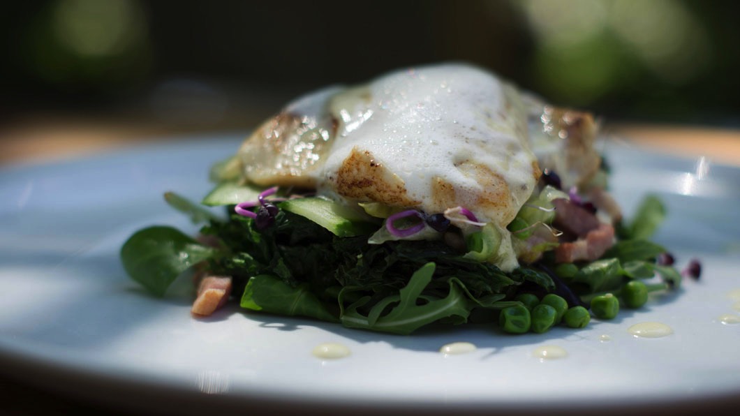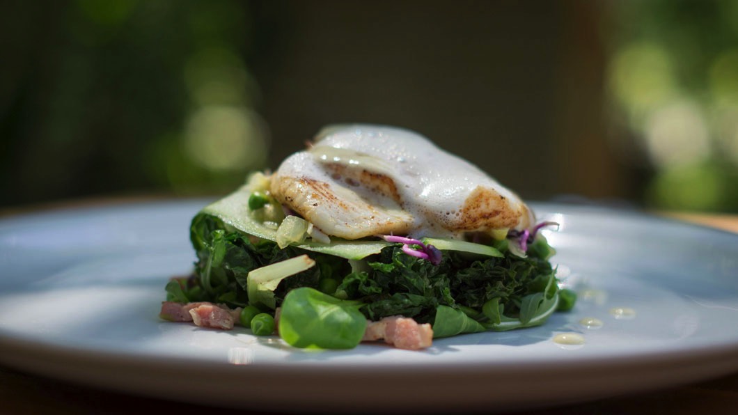 Pan Fried Plaice, Sea Lettuce, Salty Fingers, Liquorice Foam and Prosecco and Pine Sauce.